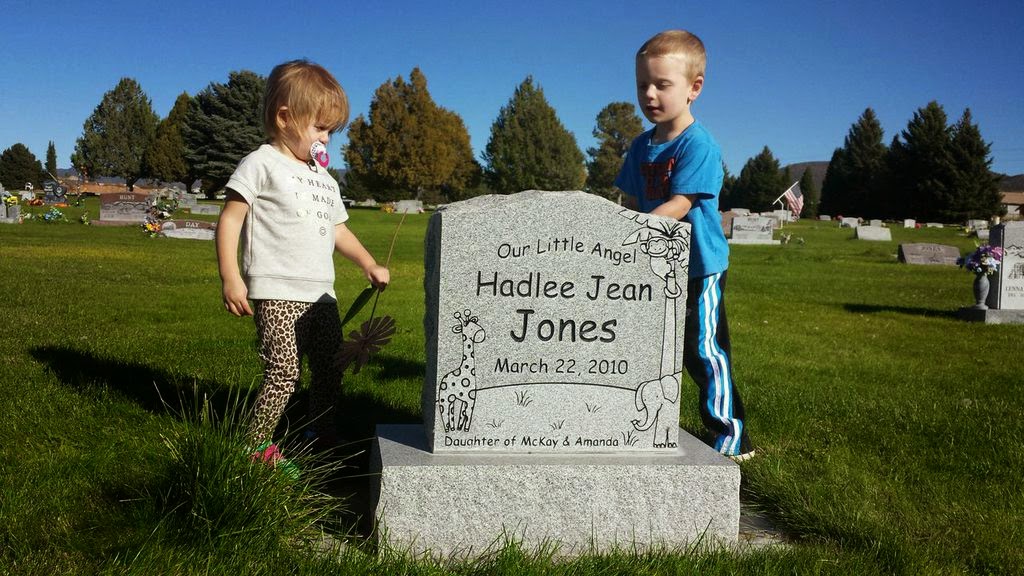 They love to look at the pictures on her headstone! The animals are the favorite but they also love the picture in the back of Jesus holding a baby and they swear it's Hadlee He's holding and I know for a time he did! They also think it is fun to see her hand and foot print and Carter is always comparing his to the one on the headstone, which is her true prints!