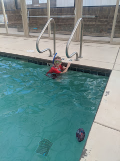 He loves going to the hotel and swimming! He could spend hours in the pool! He is a great swimmer!